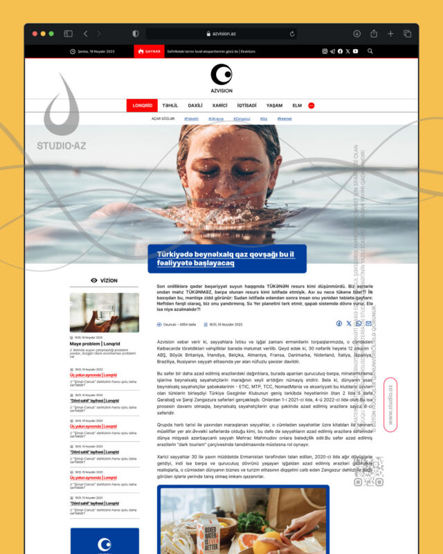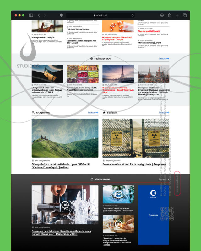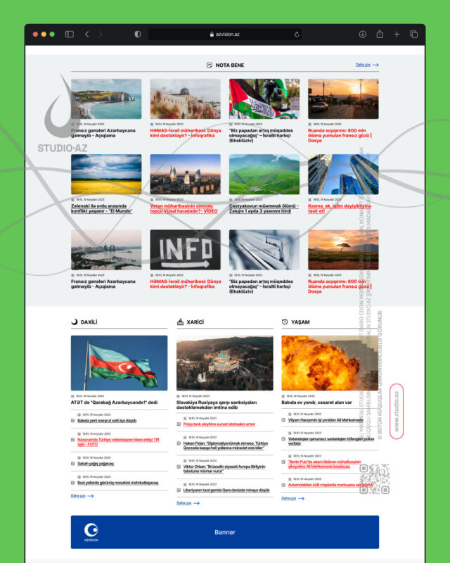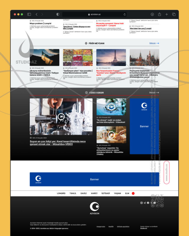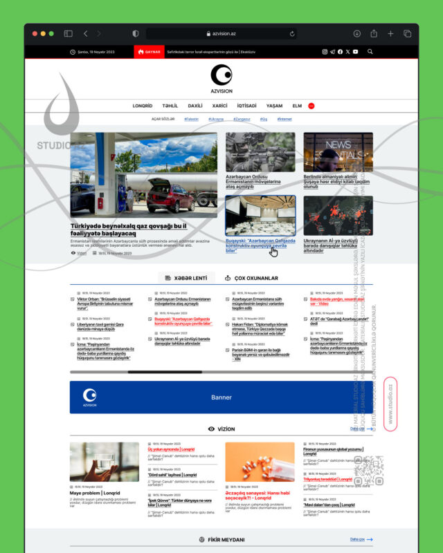 Məqsədimiz – saytın milli və eyni zamanda müasir, etibarlı media imicini əks etdirəcək Vizual kimliyinin hazırlanması idi. Yetkil qərar belə oldu ki, saytın loqotipi sadə və yadda qalan dizayna, rəng palitrası isə peşəkarlıq və obyektivliyi vurğulacaq qara və ağ tonlardan ibarət olmalıdır. Saytda isə oxunaqlı fontlar və balanslı tərtibatı ön planda saxlayaraq, xəbərlərin asan qavranmasını təmin edəcək bir konsepsiya hazırladıq. Bu vizual üslub AzVision.az-ın informasiya mənbəyi kimi milliliyini, ciddiliyini və auditoriyaya olan hörmətini əks etdirir.